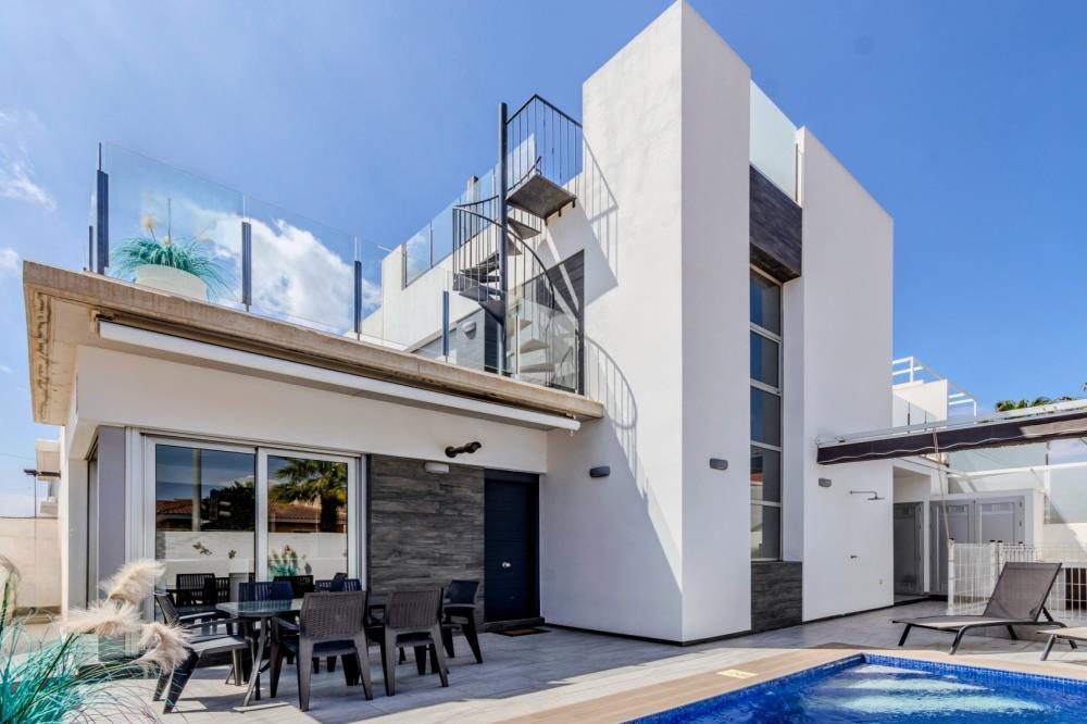Costa Blanca Rojales Benijofar restaurant Guardamar golfbaan La Mata golven Torrevieja strand zout meren Formentera Alicante vliegveld zon vakantie mooi palmboom prive luxe modern uitzicht rustig hond toegestaan vakantiewoning winkel Spanje dorp charmante loopafstand dichtbij bar wijn tapas luxueuze woning keuken zonneterras solarium tuin prachtig ontspannen dineren fantastisch airconditioning Wifi internet terras Elches Zenia Boulevard
